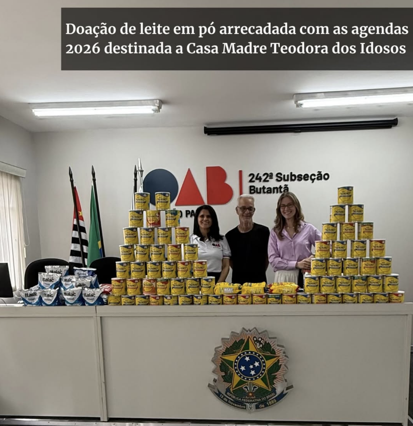 Com muita alegria comunicamos que a arrecadação de leite em pó, proveniente da ação das agendas OAB Butantã 2026, foi destinada a Casa Madre Teodora dos Idosos.