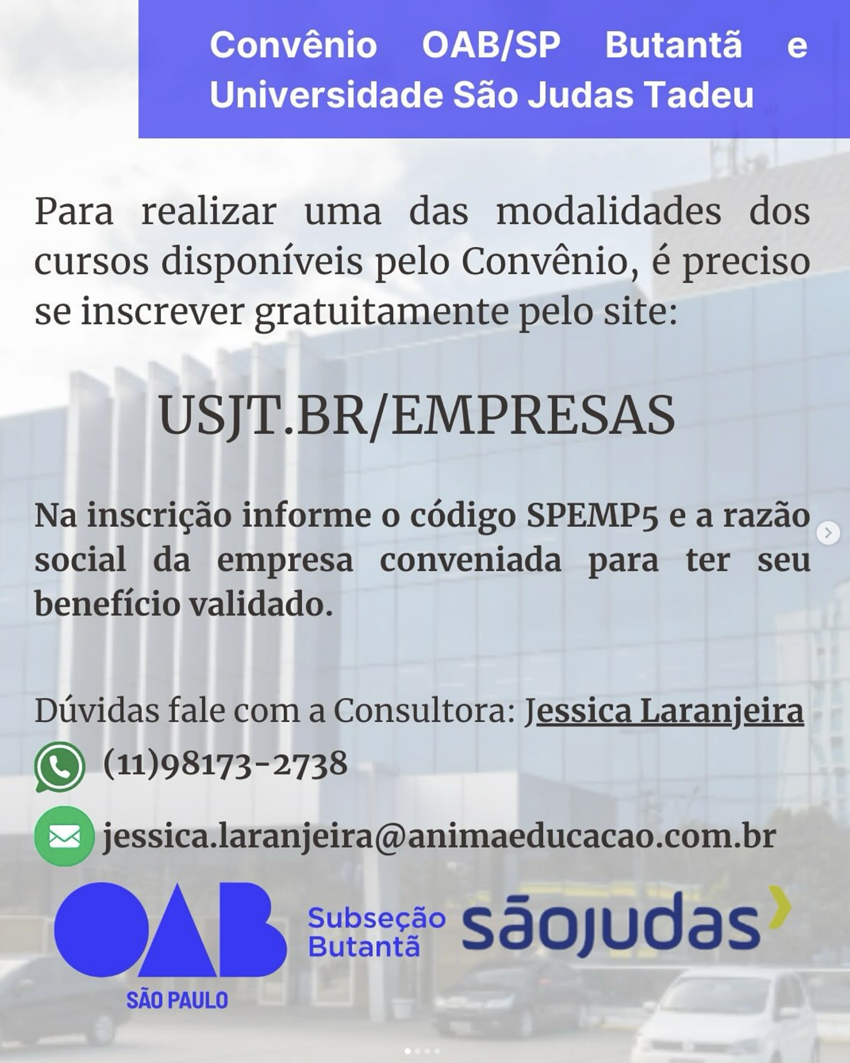 Você sabia que no ano de 2025 a OAB Butantã firmou convênio com a Universidade São Judas Tadeu para garantir descontos em cursos?